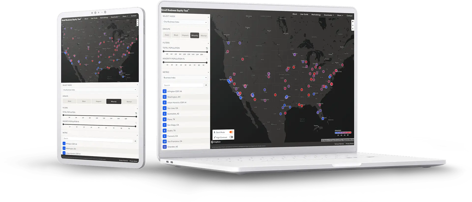 The Small Business Equity Toolkit, sponsored by Mastercard’s Center for Inclusive Growth, is a pioneering tool designed to support local leaders in addressing disparities in business ownership among minority groups. This first-of-its-kind data tool helps leaders offers critical insights into the challenges faced by Black-, Latino-, Asian-, and women-owned businesses across the top 100 metro regions. The tool enables leaders to assess the gaps in their small business ecosystem and develop actionable strategies toward achieving an inclusive recovery.