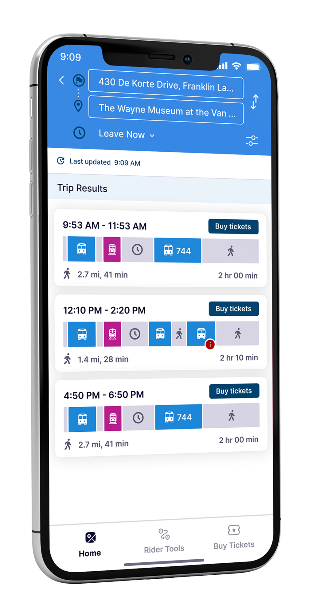The redesigned planner provides real-time routes, transfer info, and departure times based on the rider’s location. It’s fast, accurate, and built for planning across train, bus, and light rail — no need to leave the app.